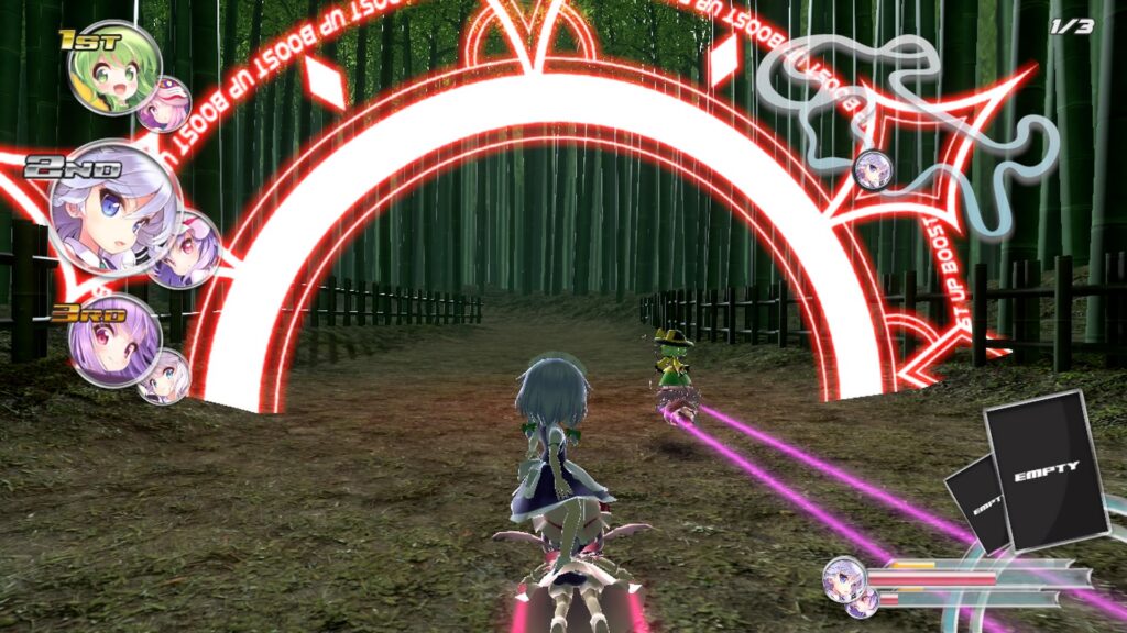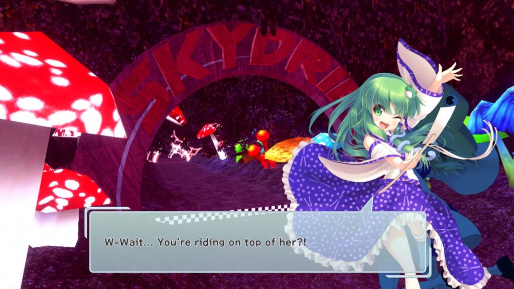 Varför åker de på varandra då? Jo, häxornas magiska krafter håller på att stjälas av en ondsint antagonist, så genom att åka på varandra förstärks deras magi och de kan… ja, inte använda kvastar eller något. Handlingen i Gensou Skydrift är inte så viktig eller särskilt djuplodande, men det finns ett kampanjläge för den som är intresserad. I mångt och mycket liknar spelet de flesta andra spel inom genren. Det finns ett hyfsat utbud av nivåer att tävla på, ett antal karaktärer att spela som och ett mindre antal trollformler som påverkar en själv eller motståndarna.