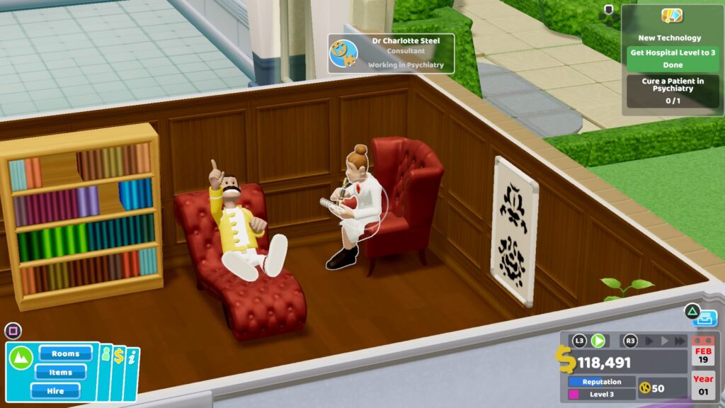 Spelet är likt andra spel i genren tänkt att ständigt hålla spelaren aktiv och på tårna, något som i det här fallet innebär att jag måste agera byggmästare, ekonom, projektledare och personalchef på samma gång. Så fort jag startar min inrättning kommer patienterna promenerande in genom entrén med diverse problem.